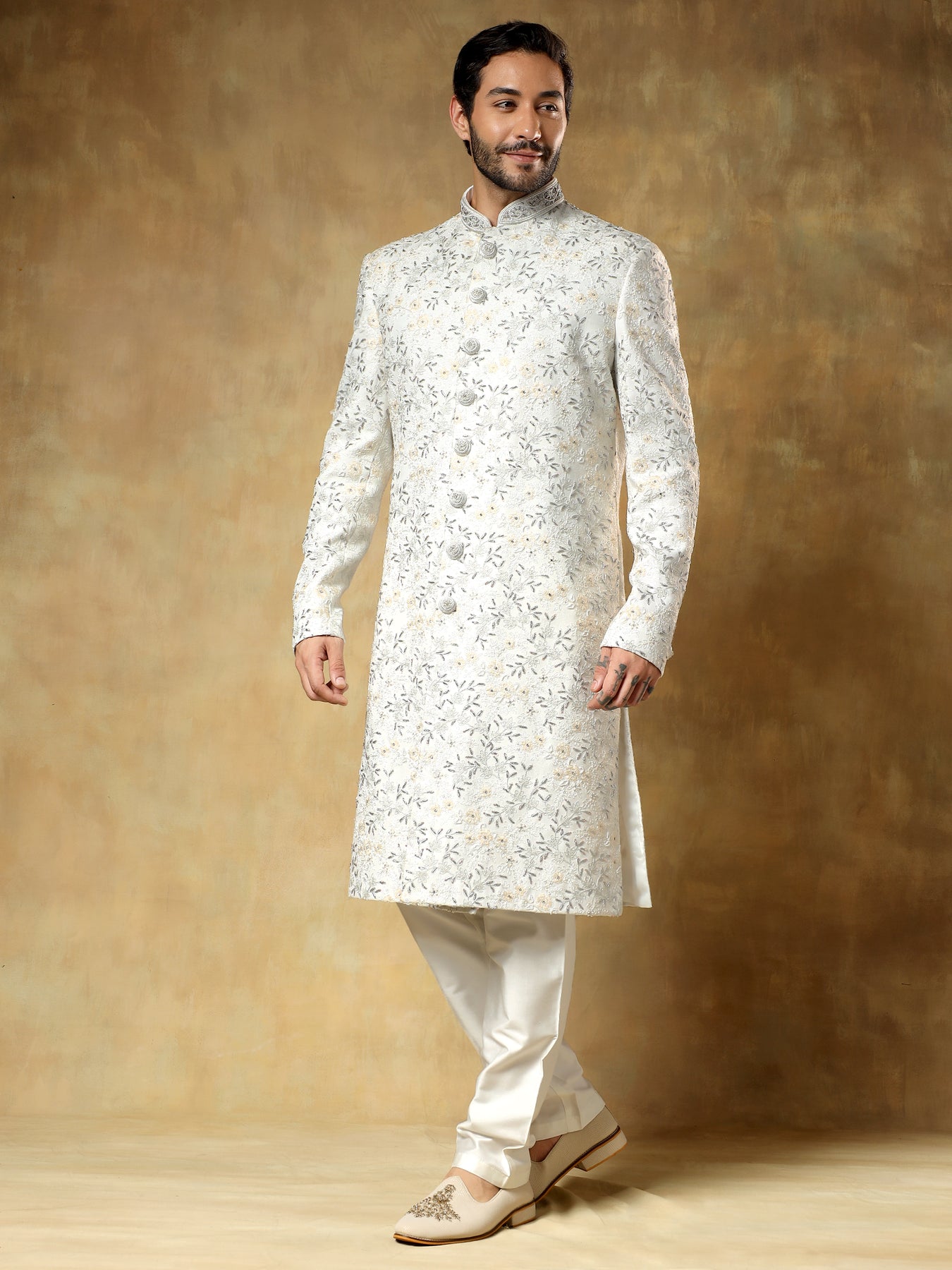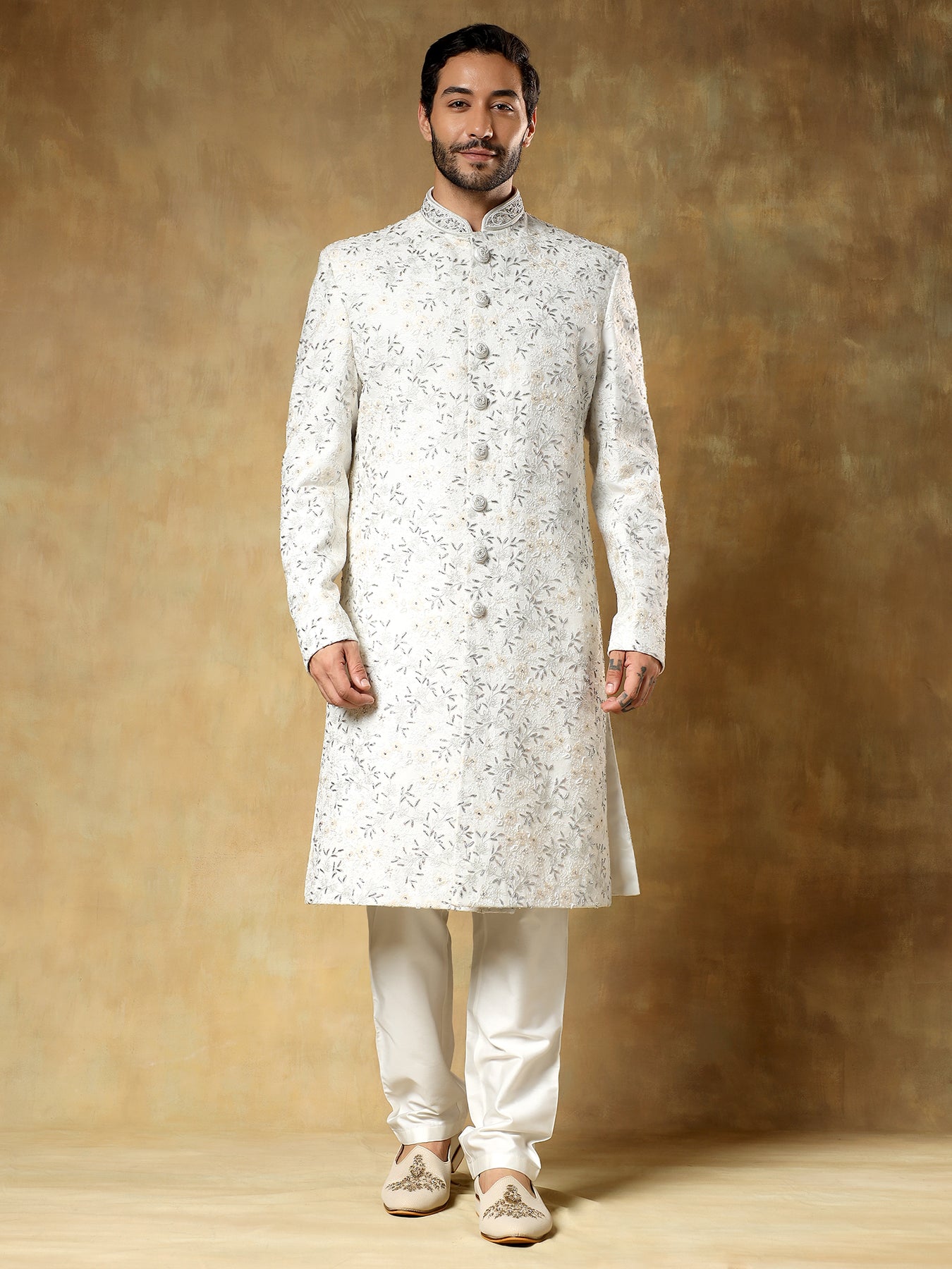 This white sherwani is detailed with delicate floral thread & hand embroidery , giving it a refined yet contemporary charm. Paired with a matching churidar, it makes for an elegant choice for weddings, engagements, or day events.